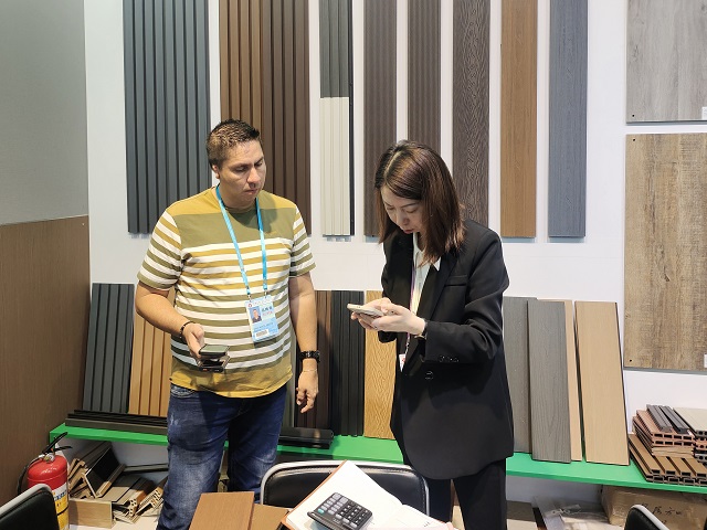 建材展位重點(diǎn)推出了墻板,格柵,樓梯踏板以及木塑戶外地板等新產(chǎn)品,從室內(nèi)到戶外產(chǎn)品一應(yīng)俱全。參展部門根據(jù)對(duì)去年秋季交易會(huì)的考察分析以及近期客戶最新詢盤情況的整合梳理,積極開拓更新參展產(chǎn)品。結(jié)合國(guó)外最新流行的趨勢(shì),推出了拼花木紋,石紋等當(dāng)下十分暢銷的花色。利用立體燈箱,將產(chǎn)品優(yōu)勢(shì),產(chǎn)品結(jié)構(gòu)剖面等信息直觀展示,讓客戶更加清晰地了解產(chǎn)品的性能和優(yōu)點(diǎn),吸引諸多專業(yè)買家的觀看和洽談。此外,在攤位新增產(chǎn)品拼裝的體驗(yàn)區(qū),增加產(chǎn)品小樣及配件的DIY拼裝,吸引客戶自己動(dòng)手,大大提升了參與度和體驗(yàn)感,讓客戶真切地感受到安糧的誠(chéng)意與新意。